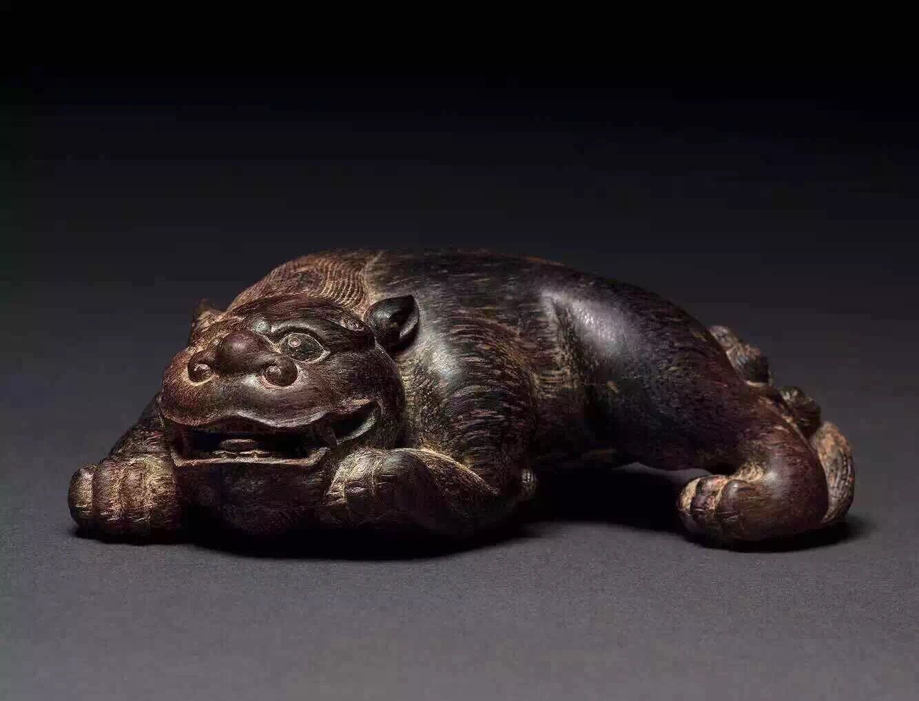 该件瑞兽头形扁平,圆眼大耳,前爪粗壮尖利,后腿蹲状,脊锦鳞纹,尾巴与身躯无明显区别,尾类呈卷状,重91.12克的的沉香螭龙既有青铜器的金石味,又有玉器的流畅感,是件难得的饰品。
