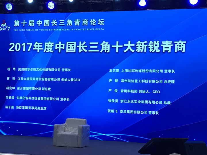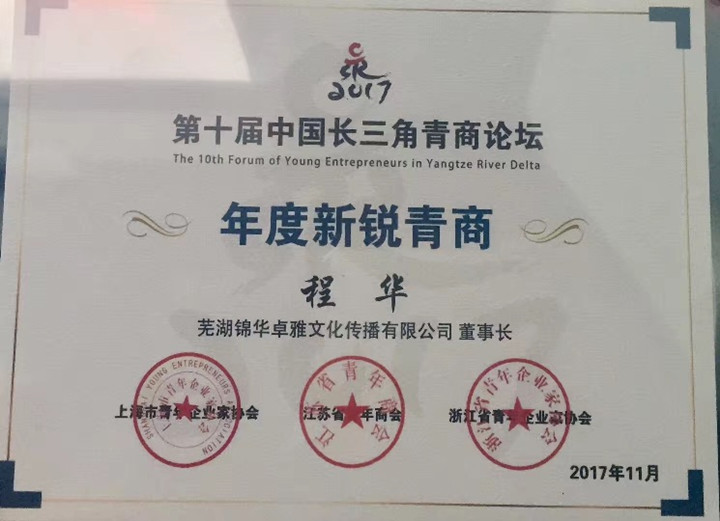论坛现场颁奖典礼上,芜湖锦华卓雅文化传播有限公司董事长程华获“长三角十大新锐青商”殊荣。站上新的历史起点,青年企业家们在中华民族文化复兴之路上,将肩负起新时代赋予的责任和担当,携手共同努力,做好当代企业家精神的实践者。