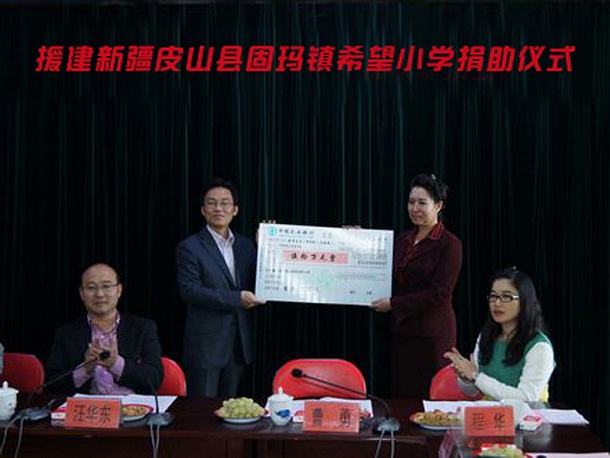 团省委一行又深入皮山县,考察皮山县固玛镇小学、安徽省援建皮山县农民新居改造工程示范点,举行团安徽省委对口援建皮山团县委座谈会暨援建固玛镇希望小学捐助仪式。仪式上,安徽省青基会向皮山县固玛镇小学捐款50万元,用于建设固玛镇希望小学,大力支持希望学校的发展,为皮山的学生们更加健康快乐地成长尽一份力量。